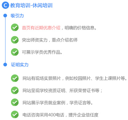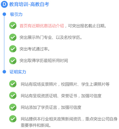 下面列出教育行业之二级行业建站要素。页面如何讨人喜欢?如何证明你的权威性?如何吸引网民报名?客官往下看: